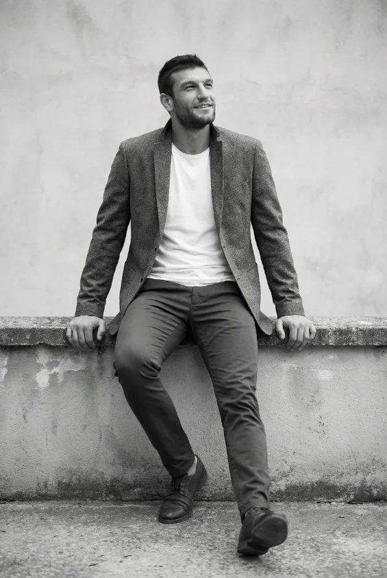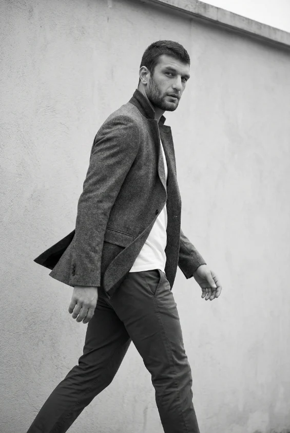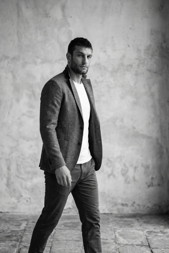 Монохромная фотосессия, выстроенная вокруг сдержанной мужской элегантности — текстурированная штукатурка, рассеянный студийный свет, глубокие серые тона и почти осязаемая фактура ткани. Визуальный код этих кадров отсылает к европейскому мужскому эдиториалу конца девяностых — началу двухтысячных: минимализм без стерильности, характер без позёрства. Каждый образ дышит спокойной уверенностью, где контраст между грубой текстурой фона и мягкостью одежды создаёт напряжение, удерживающее взгляд.