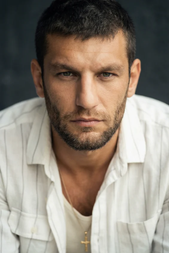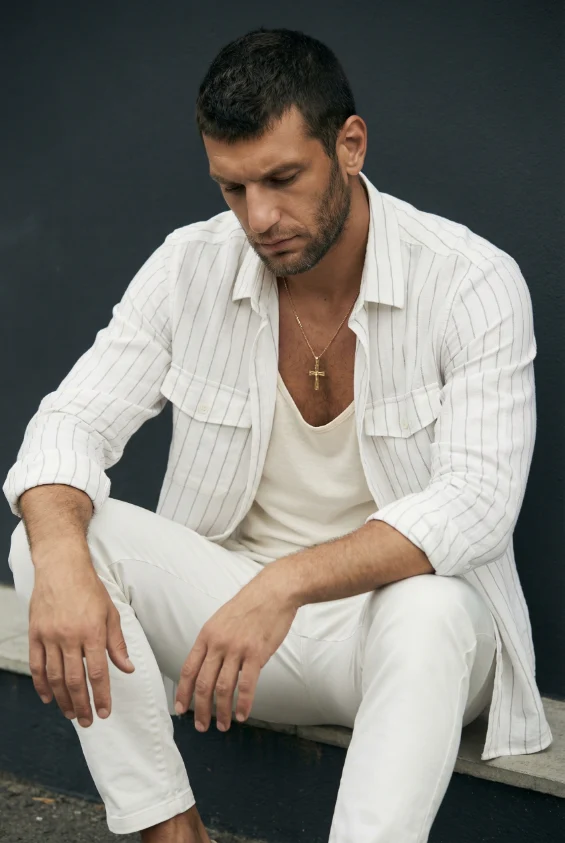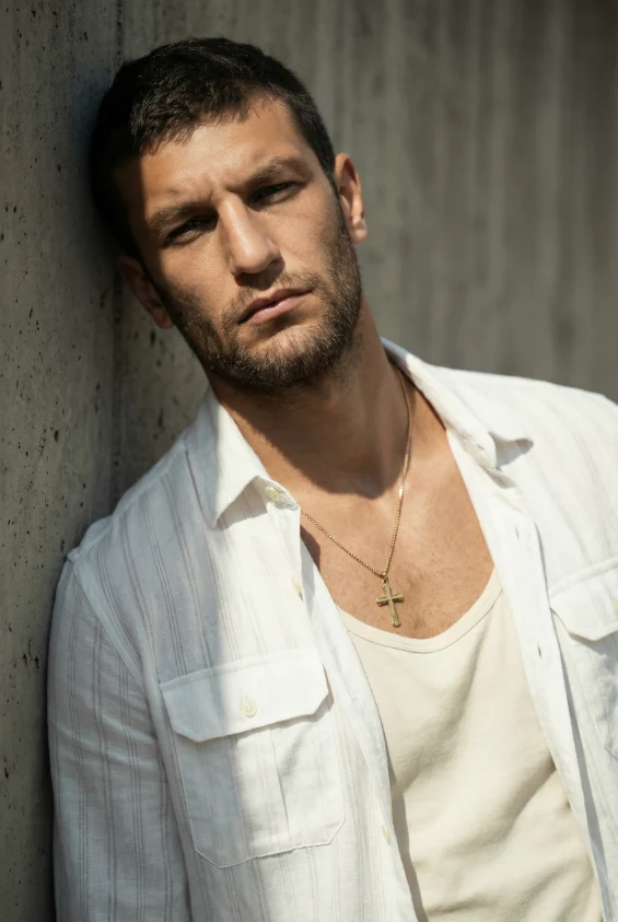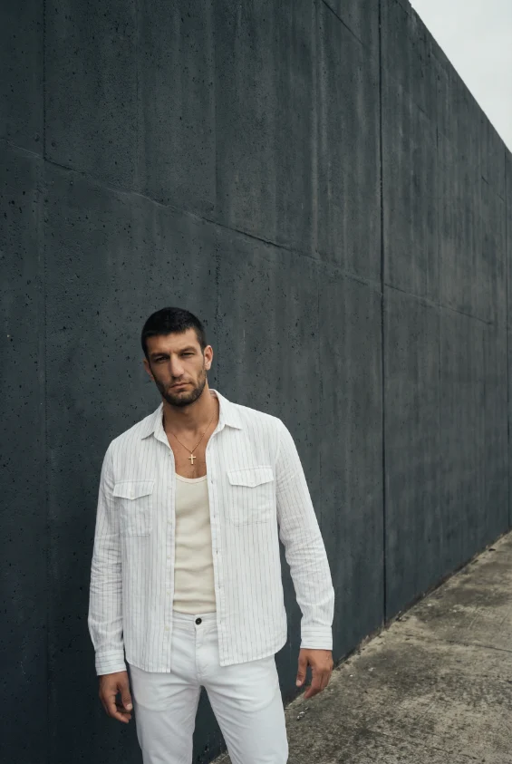 Строгая монохромная элегантность встречается с уличной мужской силой — именно так можно описать визуальный код этой фотосессии. Тёмный бетонный фон, выбеленный образ на переднем плане, мягкий рассеянный дневной свет с глубокими тенями по краям — всё это создаёт контраст, знакомый по съёмкам для мужских глянцевых журналов. Цветовая палитра построена на противопоставлении: холодный тёмно-серый бетон и тёплые кремово-белые тона одежды, слегка подчёркнутые золотом аксессуаров. Кадры живут в одном дыхании — напряжённом, уверенном, кинематографичном.